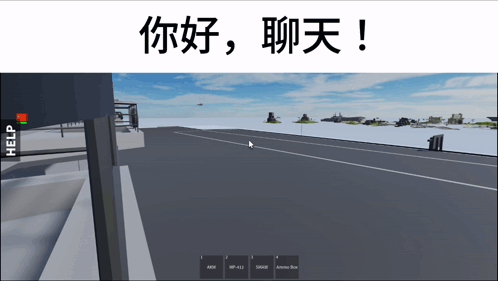 A J-15 jet landing on an aircraft carrier in the Roblox game 'Seas Of Conflict', with 'Hello, chat!' in Chinese.