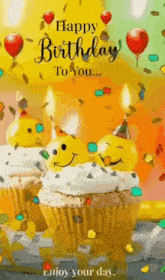 An animated birthday card features three cupcakes with smiley-face candles, balloons, and falling confetti.