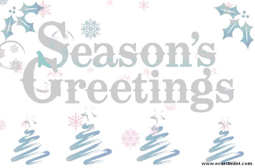 Animated Season's Greetings card with festive trees, snowflakes, and holly for holiday wishes.