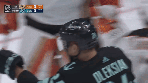 Seattle Kraken player Jamie Oleksiak celebrates a goal with teammates during an NHL game.