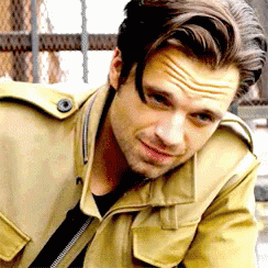 Sebastian Stan smiles charmingly in slow motion, wearing a tan jacket and black shirt.