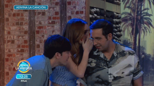 Cynthia Rodriguez whispers to El Capi while Roger Gonzalez watches during a segment of Venga La Alegría.