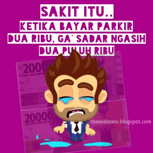 A crying cartoon man laments over accidentally paying 20,000 Rupiah for a 2,000 Rupiah parking fee.