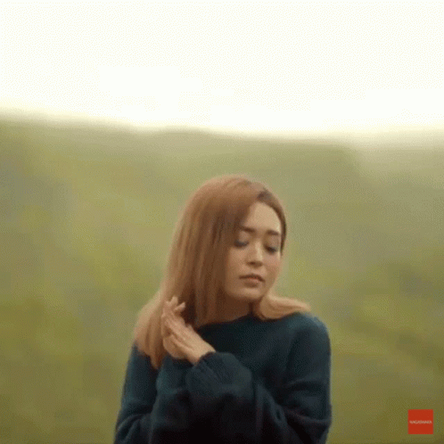 Dinda Permata looking sad and pensive in a misty field, wearing a blue sweater.