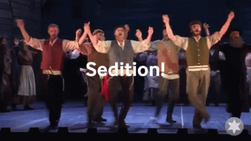 Men dance on stage with 'Sedition!' text, reminiscent of the musical Fiddler On The Roof.