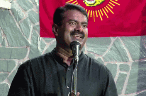 Seeman, leader of NTK, delivers a passionate speech into a microphone in front of a party flag.