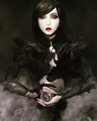 A stylized painting of a dark-haired seer with pale skin and red lips, holding a crystal ball with a skull inside.