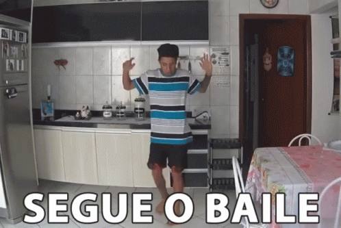 Mathues Yurley dancing in a kitchen with 'Segue O Baile' text, showing off his energetic moves.