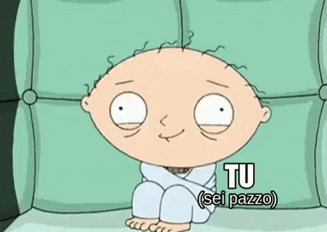 Stewie Griffin from Family Guy in a straitjacket, with the Italian caption 'TU (sei pazzo)'.