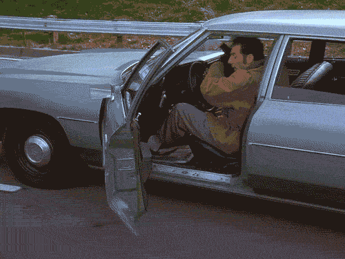 Kramer from Seinfeld hilariously attempts to paint a white line on the road from inside his car, struggling with the long roller.
