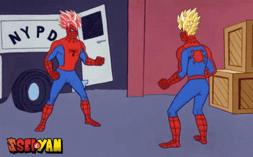 Two Super Saiyan-haired Spider-Men, one pink and one yellow, point at each other in a classic meme.