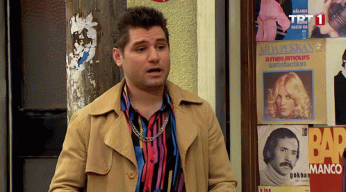 Seksenler's Sahin expresses 'Pof Oldum Ya' while standing in front of a wall adorned with retro music posters.