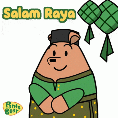 Pants Bear cartoon character in traditional Malay attire wishing Selamat Hari Raya Idul Fitri with ketupat.