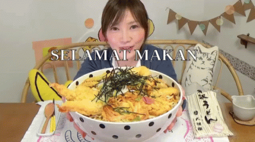 Yuka Kinoshita presents a giant bowl of ramen with tempura, smiling at the camera with "Selamat Makan" on screen.