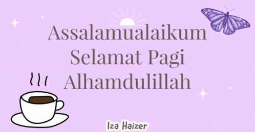 Iza Haizer shares a morning greeting with 'Assalamualaikum Selamat Pagi Alhamdulillah' on a purple background.