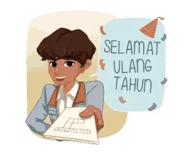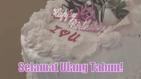 A white birthday cake with 'Happy Birthday' and 'I <3 U' decorations, and 'Selamat Ulang Tahun!' text.