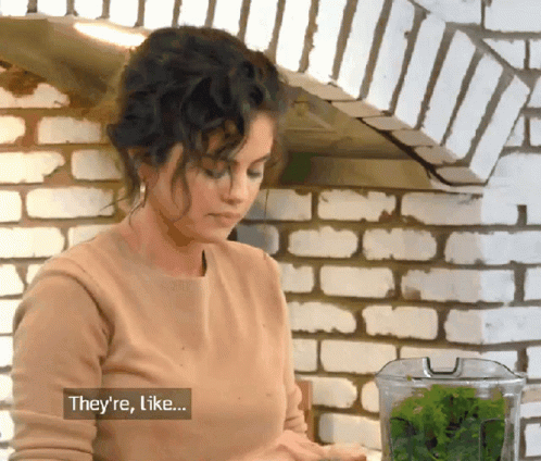Selena Gomez smiles while adding fresh cilantro to a blender, preparing a dish on her show Selena + Chef.