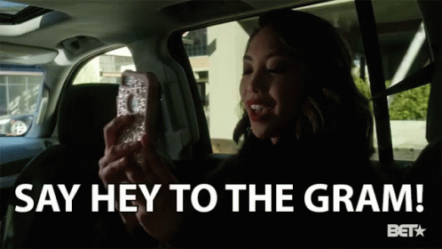 A woman in a car takes a selfie, smiling and saying 'Hey to the Gram!' for Instagram.