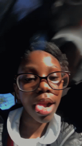 Girl in glasses makes a kissy face and sticks out her tongue while posing for a selfie.