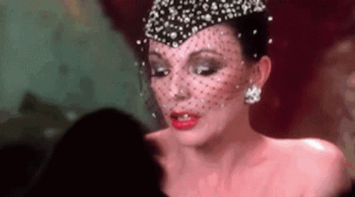 A glamorous woman in a sparkly tiara and veil smirks with self-satisfaction.