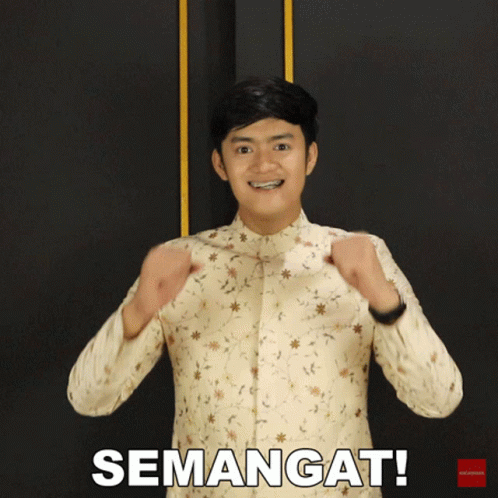 Denias, wearing a floral shirt, pumps his fists with enthusiasm, conveying the message 'Semangat!' (Keep Going!).