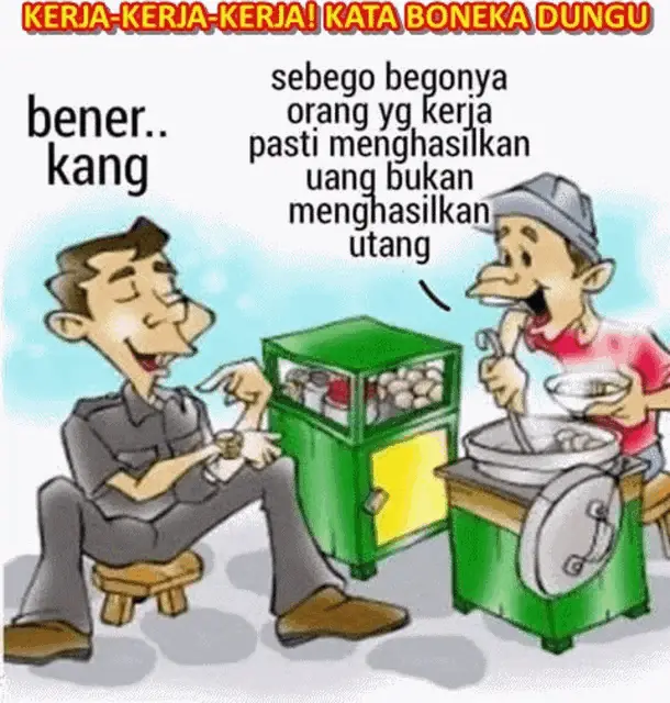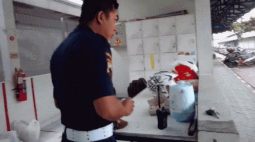 A security guard in a blue uniform at his post, with overlaid text encouraging work and diligence.