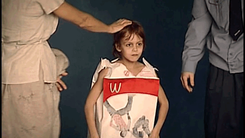 A child in a McDonald's bag costume is praised by adults and a police officer in a comedic sketch, likely from Nasha Russia.