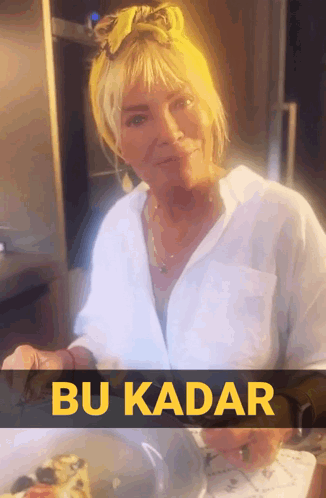 Semiramis Pekkan, wearing a white shirt, smiles and gestures while the caption 'Bu Kadar' appears.