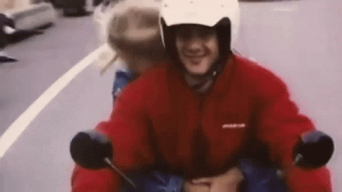 Ayrton Senna riding a red Ducati motorcycle with a woman as a passenger through a city street.