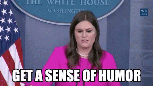 Sarah Huckabee Sanders at the White House press briefing, delivering the line 'Get a Sense of Humor'.