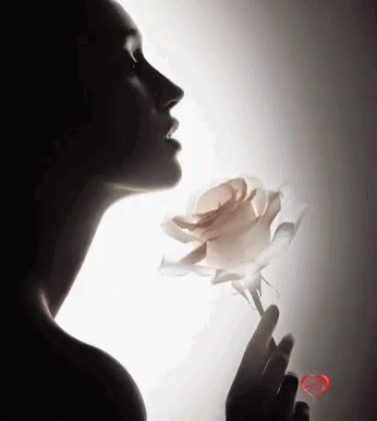 Elegant silhouette of a woman holding a luminous white rose, bathed in soft light with sparkling effects.