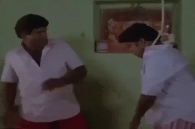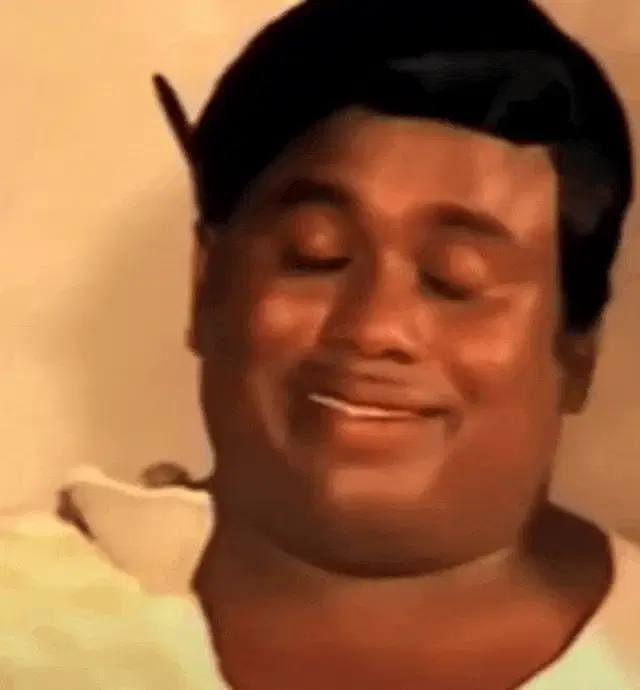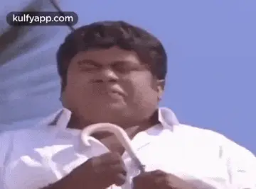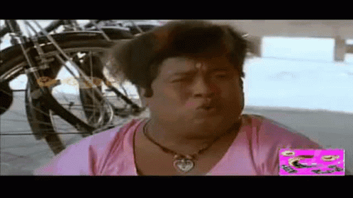 Senthil Koundar performs a comedic lip-sync, sitting in front of a bicycle with headphones and a necklace.