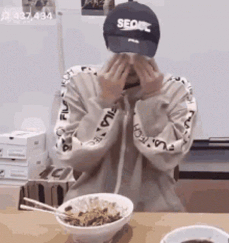 Seokjin dramatically fake cries before quickly starting to eat his meal with chopsticks.