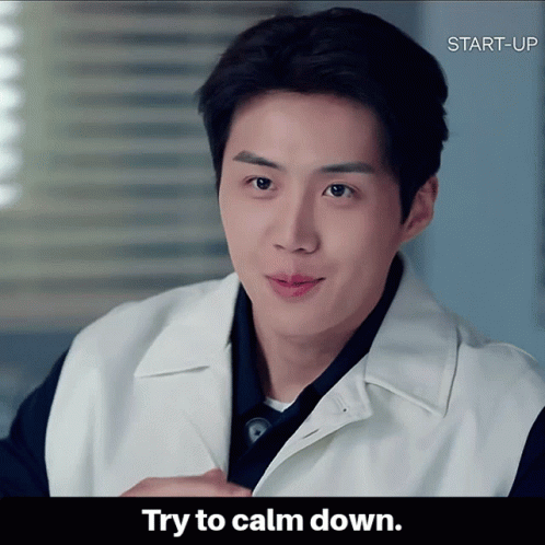 Kim Seon-ho, as Han Ji-pyeong from Start-Up, with a calm expression and the caption "Try to calm down."