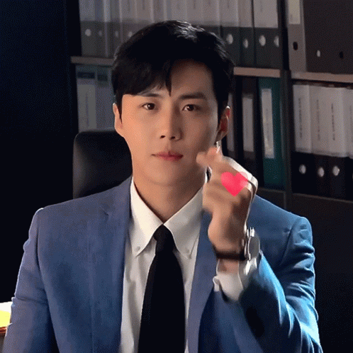 Kim Seon-ho, dressed in a suit, makes cute finger hearts for the camera.