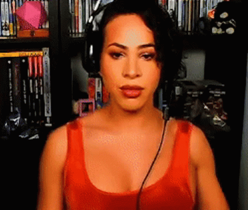Sephie Persephiroth, wearing a red tank top and headphones, smiles while holding a decorative Japanese wave fan.