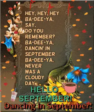 A cheerful animated bear in green overalls celebrates the arrival of September with a big smile and open arms.