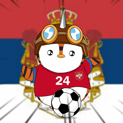 A cute cartoon penguin character in a Serbian soccer jersey, ready to play with a football.
