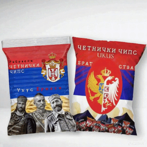Two bags of Serbian Chetnik chips featuring the Serbian flag and historical figures, with chips falling.