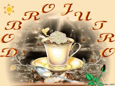 Animated 'Dobro Jutro' (Good Morning) message in Serbian, with a coffee cup.