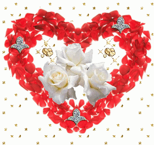 A beautiful heart shape crafted from vibrant red rose petals, adorned with delicate white roses in the center.