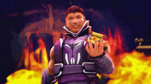 Serega Pirat, a man in purple armor, stands confidently holding a weapon against a backdrop of intense flames.