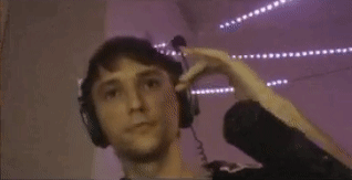Sergey Pirate in headphones, making hand gestures and vibing in front of a microphone with purple lights.
