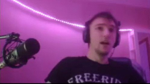 Серегапират, wearing headphones and a black shirt, talks into a microphone in a pink-lit room.