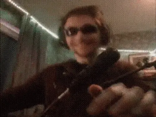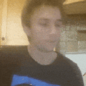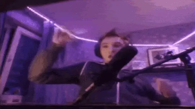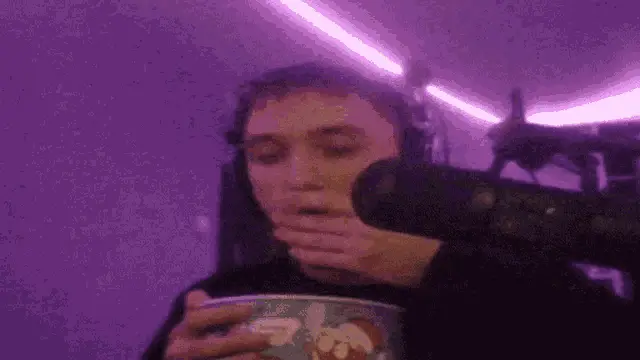 Serega Pirat, wearing a black shirt with a blue stripe, speaks to the camera.