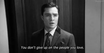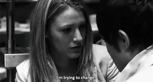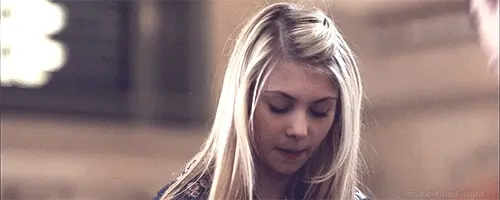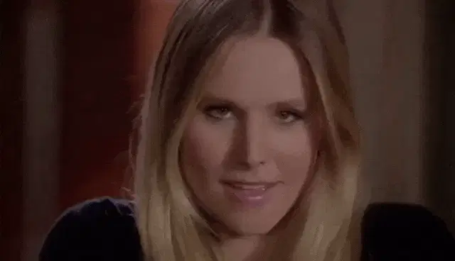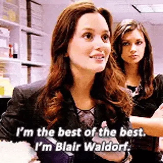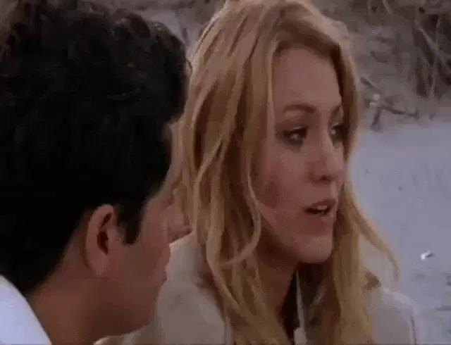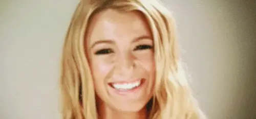 Serena from Gossip Girl smiling and gesturing animatedly in a warmly lit room, wearing a grey cardigan.