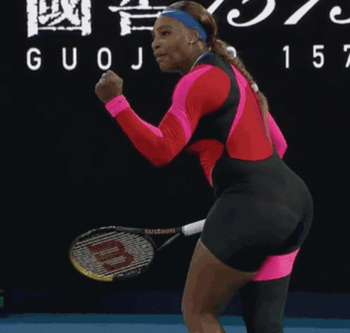 Serena Williams celebrates a point with an intense fist pump on the tennis court, showing her fierce determination.