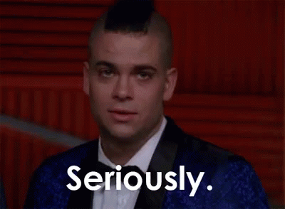 Mark Salling as Puck from Glee, wearing a tuxedo and mohawk, looks seriously at the camera.