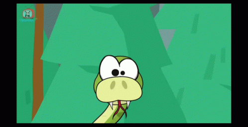 A cartoon snake with question marks above its head, then two red ants appear in a forest.