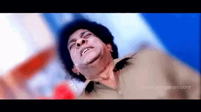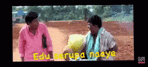 Two men on a dirt road, one speaking the Tamil phrase 'Edu seruppa naaye' (Take the slipper, dog).